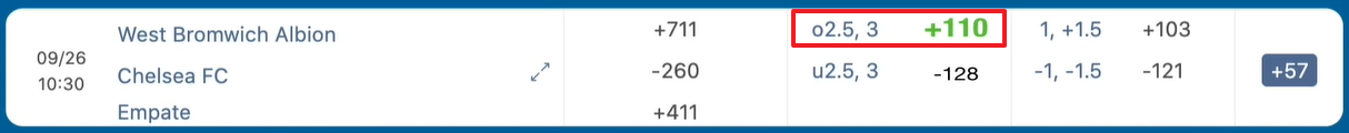 If we bet $100 to win $110, choosing a line of over 2.5 and over 3, the bet is divided as follows: